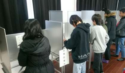 実際の選挙の時に使われる投票記載台や用紙、投票箱を使わせていただき、同じ手順で模擬投票開始です。