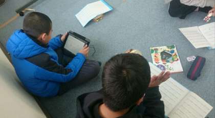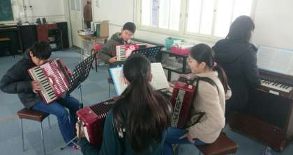 音楽科では、今日から2曲目の合奏曲の練習がはじまりました。タブレットを使いながら練習している子もいます。