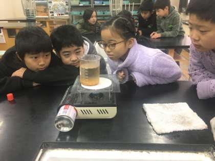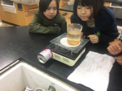 もののあたたまり方、第1弾は金属、第2弾は水でした。水を熱すると、どのようにして全体があたたまっていくの??という疑問を持ち、ビーカーの水の中に木くずを入れて熱し、動きを見ました。