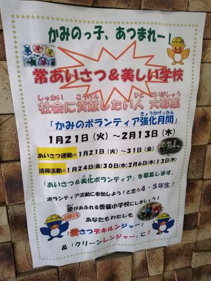 はじめてボランティア活動に参加する4年生もたくさんの児童が大きな声であいさつしてくれています。もうすぐ高学年の仲間入り。4年生頼もしいです!