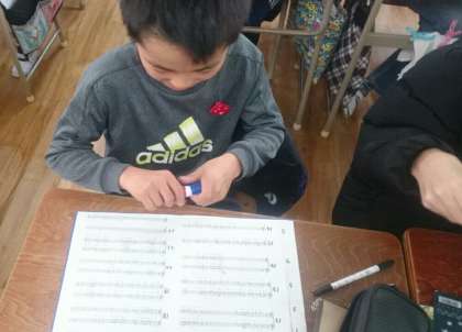 授業では、参観で演奏するリコーダー曲も練習しました。3年生から習っているリコーダーの集大成ともいえる、難易度の高めの曲(高いシ♭が登場します!)ですが、覚えて吹けている子が増えてきています。