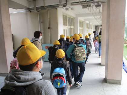 今日は待ちに待った図工展。並んで歩くフォーメーションの確認もバッチリ!高学年は低学年の友だちと手をつないで歩きます。意気揚々と学校を出発しました!!