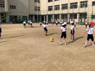 友だちとパス練習、そして、ドリブルリレーをしました。