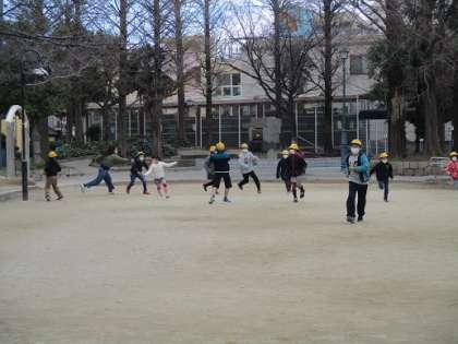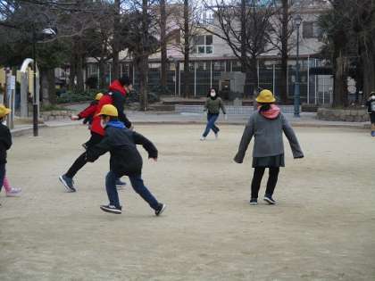 食後は、冷えた体を温めるべく「鬼ごっこタイム」へと突入しました。相談することなく問答無用で職員が鬼となり、子どもたちを追いかけました。職員の足が悲鳴をあげたところでゲームセット。4ゲームを楽しみ、子ども達はホクホクです!