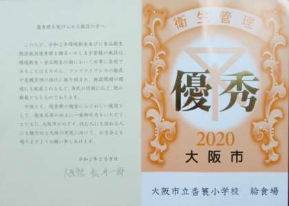本校の給食調理室が、大阪市より2020年環境衛生並びに食品衛生関連施設の優秀標を贈呈されました。