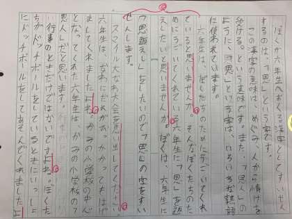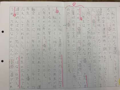 6年生に送りたい漢字を考え、それについてスピーチ原稿を書きました。推薦する理由や良さが伝わるエピソードを書き、それぞれ工夫して書くことができました。