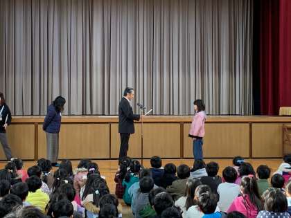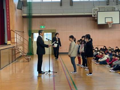 さて、今日は体育館で集会がおこなわれました。なんと、西淀川区長さんが、「に〜よん漢字道場」の表彰に来てくださり、学年より上の級で合格した児童に直接、表彰状を授与してくださいました。