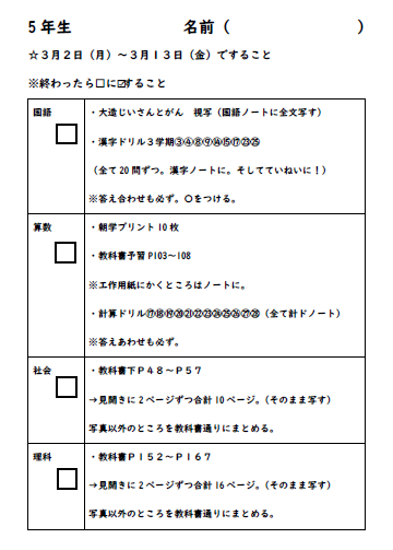 臨時休校の措置に伴い、休校期間2週間分の宿題を出しています。ドリルなどクラスにより若干進度が異なるため空欄箇所があります。お子さまが持ち帰っているプリントをご確認下さい。