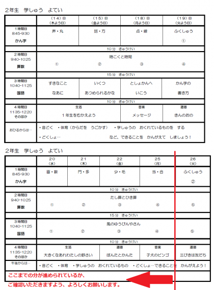 ご家庭のご都合により、学習の予定通りにプリントができていない部分があるかもしれませんが、できる範囲で学習が進められているのか、ご家庭で確かめていただけたらと思います。よろしくお願いいたします。