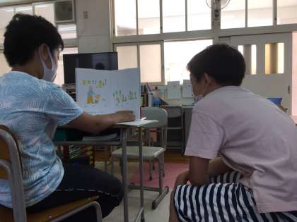 今日は、その絵本を五年生がほかの学年の友達に読み聞かせてあげました。