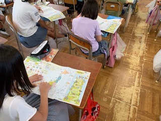 地図帳を開いて、歌を歌いながら