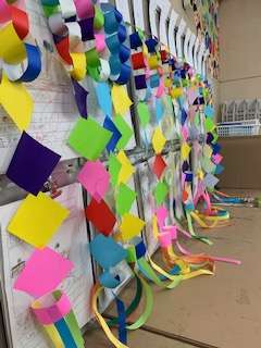 図工科の時間に、のりを使って七夕飾りを作りました。