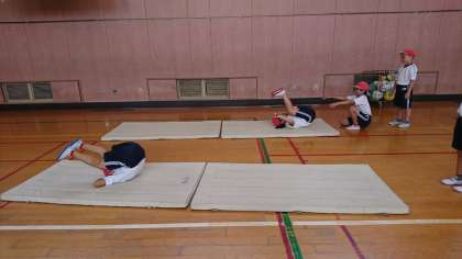 体育係さんが中心となって準備運動を行い、サーキット。色んな動きに挑戦しました。