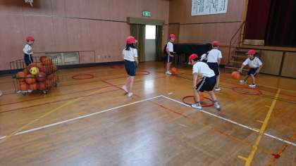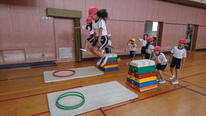 今日は、雨で運動場が乾いていなかったので講堂で体育を行いました。
