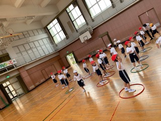 今日は雨が降ってきましたが、講堂で体育をしました。