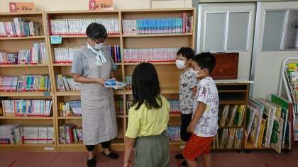 写真1枚目:図書室の本調べ