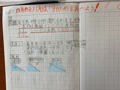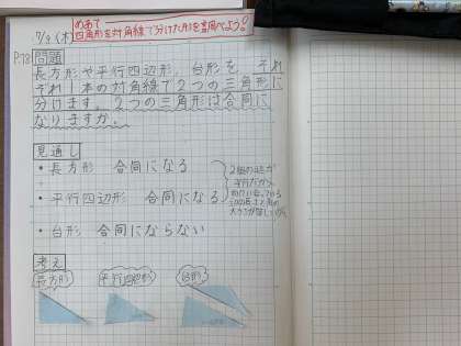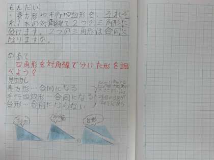 昨日より「合同な図形」の学習が始まりました。「四角形を対角線で分けた形を調べよう!」では、実際に四角形を切ってぴったり重なるのか調べました。