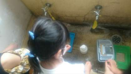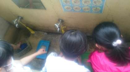 お昼休み、教室で過ごす人がなんだか少ないな??と手洗い場に行ってみると、生活科でお世話をしているザリガニのお世話をする姿を発見。