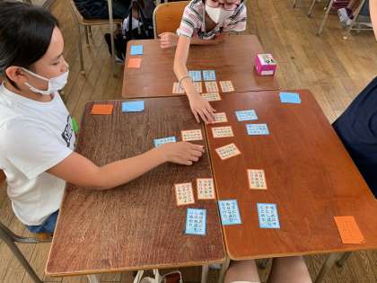 今回はグループ(3〜4人)で百人一首大会をしました。以前と同じ1〜40の句をしました。2回目なので、上の句で取れている回数が増えましたね★