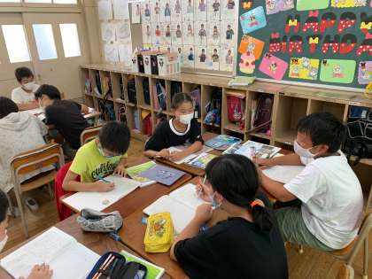 グループで交流している様子です。友だちが調べたことを聞いてメモをしています。同じことを調べている人もたくさんいたようですが、交流することでその知識がさらに確かなものになりますね!