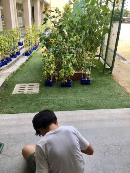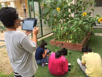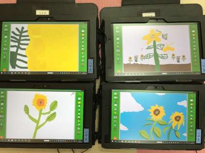 今日はなかよしの前に立派に咲いた、ひまわりをみんなで描きましたよ!
