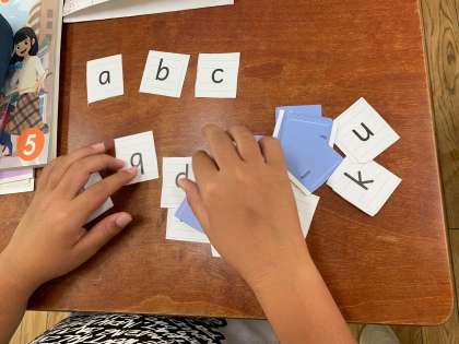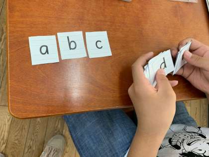 アルファベットの小文字を覚える学習をしました。まずはアルファベットの小文字を順番に繋いでいく活動をし、続いて大文字と小文字を合わせる練習をカードを使ってしました。大文字と同じような形はスムーズにできていましたが、全然形が違う文字は少し難しそうでした。