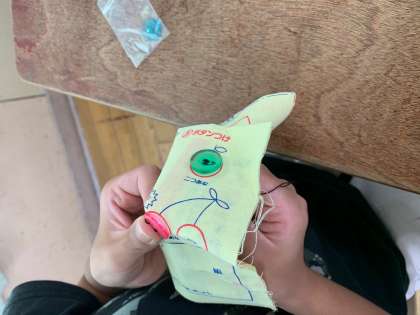 そして今日は「ボタンつけ」の練習をしました。まずは映像でつける手順を確認し、いざ挑戦!ボタンと布の間に少し隙間をつくるというのが難しそうでしたが、糸を通す場所や手順はとても上手にできていました★2学期からは小物づくりをしていくので楽しみですね。夏休み中にどんな小物をつくるのかを計画しておきましょう!