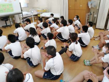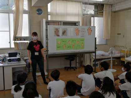 その後感染症予防についてクラスのみんなで「正しい手の洗い方」を確認しました。
