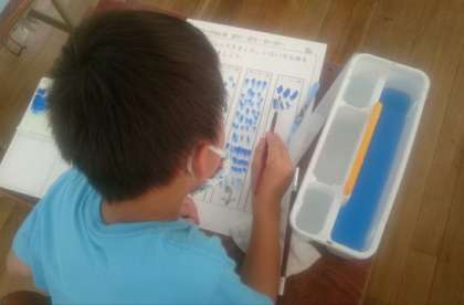 「テンテン」「ポツポツ」「ザーザー」「ドードー」の4種類の雨の降り方を、絵の具で表現しました。