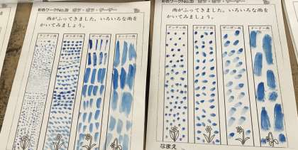 今回は、国語科「いろんな おとの あめ」でいろいろな雨の音が出てきたので、図工でもいろいろな雨をかいてみました。