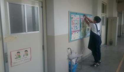 図書室ろう下に貼り出すポスターを貼り替えたり、図書室のラックにある本をチェックしたり、子どもたちが図書室を利用しやすいように環境の整備に努めてくださっています。