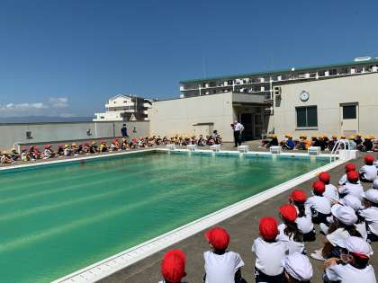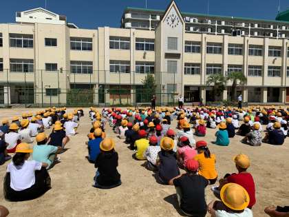 今日は先週金曜日から延期になった「880万人避難訓練」が行われました。地震が起きてから津波がくるまでを想定し、最初は運動場に避難してから屋上のプールまで避難するという流れで訓練をしました。子どもたちは「お・は・し・も」に気を付けながらしっかり話を聞いて行動することができていました。