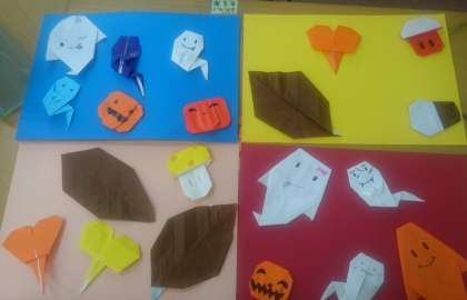 今日から10月。イチョウの葉や落ち葉、ハロウィンにちなんだ折り紙の作品を作りました。