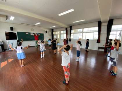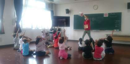 地域にお住まいのヘイマン先生が、ボランティア講師として授業をしてくださいました。日本語を使わない英語だけの時間。数を数えたり、スポーツの名前を言ったりと、時には体を動かしながら楽しく活動しました。