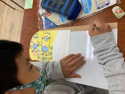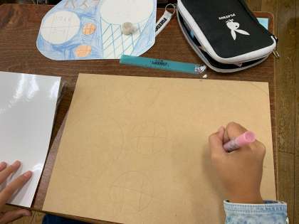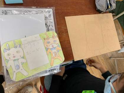 ホワイトボード伝言板を作っています。まずはデザインを考え、それを板に下書きしていきました。下書きが完成したら電動のこぎりでデザインした形に切っていきます!