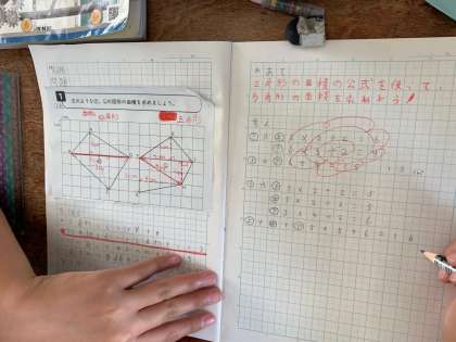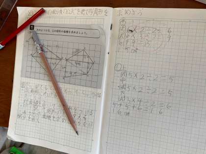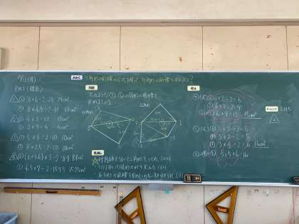 多角形の面積の求め方を考えました。今まで学習した公式を使って考えられるのかをみんなで話し合いました。そして、三角形の面積の公式を使って考えられるということをみんなで導き出すことができました。