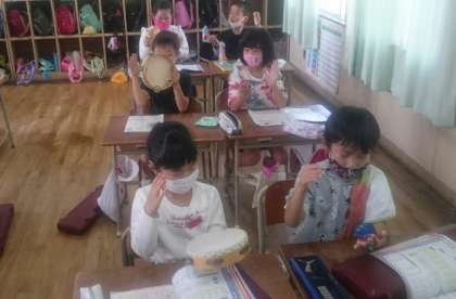 「この空とぼう」は2拍子、「いるかはざんぶらこ」は3拍子の曲です。それぞれちがった拍子であるのを感じながら、カスタネットとタンブリンでリズムの演奏をしました。