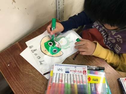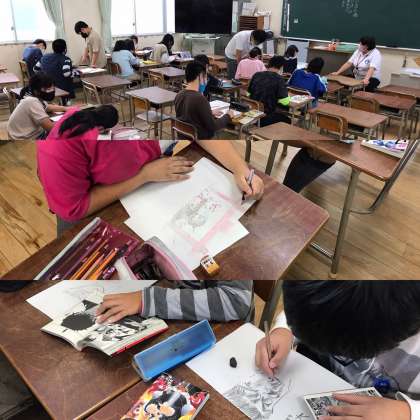 おのおの好きな漫画を紙に描き、納得いくものが完成したら、透明なフィルムに描きうつしてセル画にします。