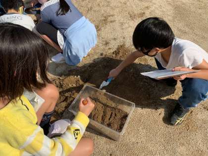 道が曲がっているところの内側と外側の流れ方の違いや石や砂が流れている様子などを観察しました。
