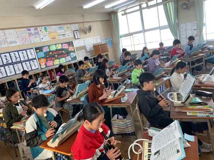 合奏の練習をしています。まずはリコーダーと鍵盤ハーモニカ、打楽器のパートの練習から始めています。