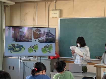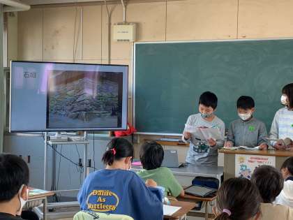 日本の伝統的な文化についてまとめたものを発表しています。「和の文化」について学習した後に、それぞれのグループで興味のある日本の文化について調べ学習をしました。そして、調べた情報を整理してパワーポイントにまとめました。「お城」「うどん」「和服」「お寿司」「刀」「武器」のグループに分かれています。