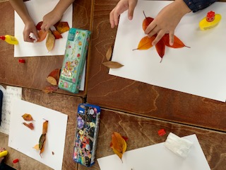 生活科、国語科、図工科の合科勉強として、校庭の落ち葉などを拾い、色々な形を作りました。
