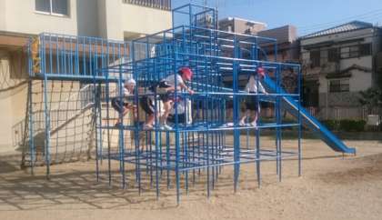 ジャングルジムでは、中をくぐり抜けたり、外をカニ歩きしたり、ラダーでは、色々な足の動かし方をしています。