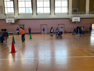 車いすに乗ってコーンで作ったコースを回ったり、車いすダンスや車いすバスケを教えてもらいました。