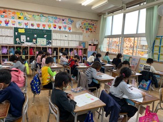 教室の窓の外に見える木の葉も秋の色です。