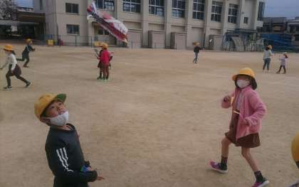 学級活動の時間を使って、運動場で飛ばしました!