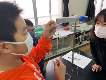 「ふりはばを変えると、ふりこが一往復する時間は変わるのか。」の実験をしました。ふりはばを10度、20度、30度と変えても結果はほとんど変わらず、子どもたちは実験をしながら不安に思っていたようです。しかし、それで実験は成功です!ふりはばを変えても一往復する時間は変わらないという結果を知って、子どもたちは驚いていました。