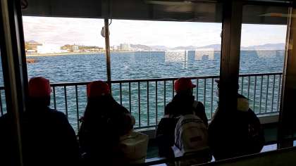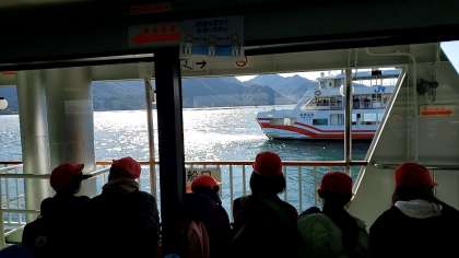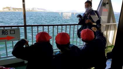 子どもたちは海の景色を眺めながら宮島を目指します。