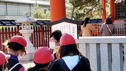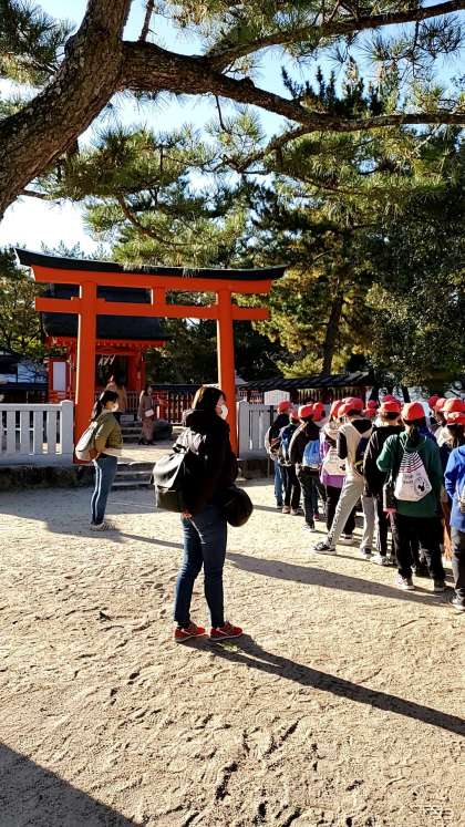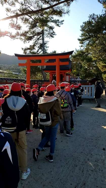 子どもたちのてきぱきとした行動でとてもスムーズに進んでいます。少し時間ができたので平清盛神社に立ち寄りました。宇野先生に「なぜ宮島と平清盛が関係があるか」「何がここで起こったのか」など解説していただきました。