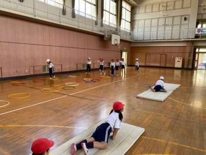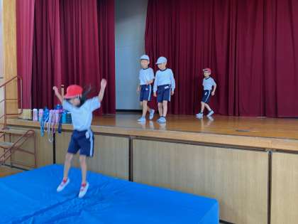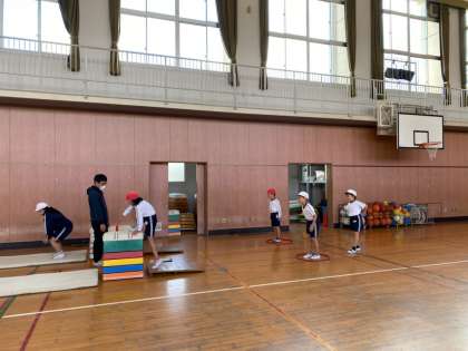 とびばこでは、またぎのりや、ふみこしとびに挑戦し、とびばこを跳ぶための基礎を固めていきます。新しいことに、子どもたちはワクワク。両手で手をつき、両足でしっかりと着地できるように、頑張りましょう!